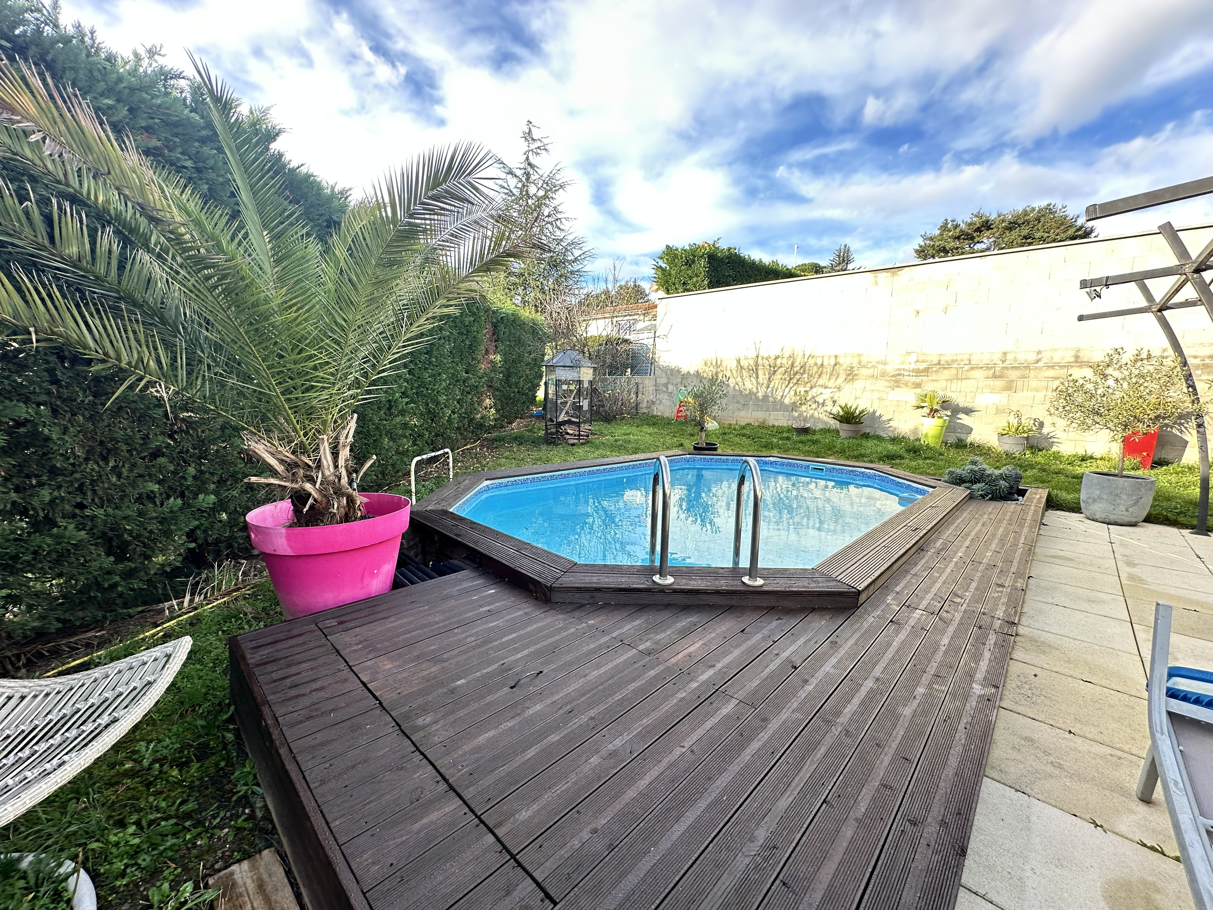 Coté extérieurs : un parking pouvant accueillir jusqu'a 5 véhicule, un coin jardin et un terrain aménagé aux abords de la piscine (piscine en bois enterrée).